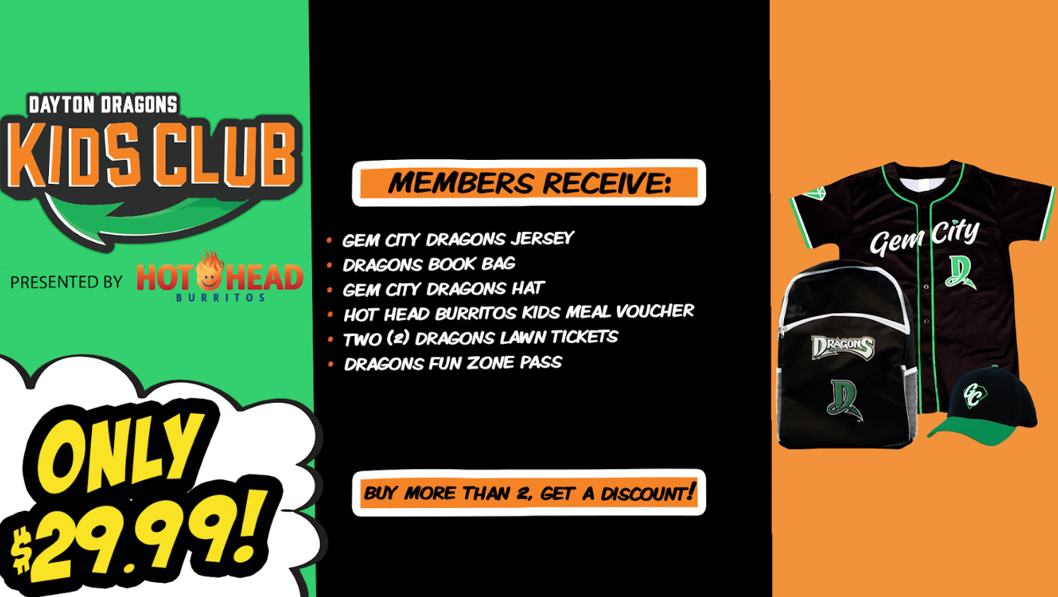 The Dayton Dragons Kids Club returns in 2026 featuring the “Gem City” Dragons jersey. During the month of April, the Dragons Kids Club is only $29.99! This season, if you order more than two memberships, each additional membership is discounted by $5. The full package of the Dragons Kids Club total value is over $100. There are limited quantities and sizes, so be sure to buy now!